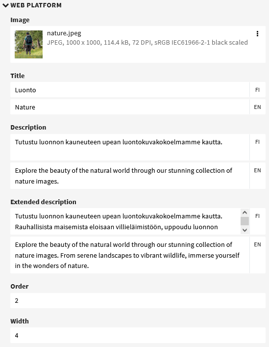 Width | Set the display width of the item in navigation. Values to use: 1: The item covers the entire width 2: The item covers 50% of the available width 4: The item covers 25% of the available width The image can be made non-clickable by adding a minus sign (-) in front of the number (e.g. -2). |