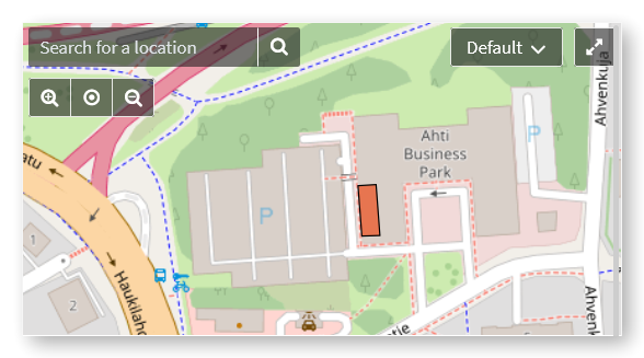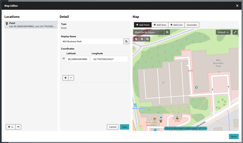 Karttaeditorin käyttöliittymä, jossa näytetään Ahti Business Parkin sijainti kartalla koordinaatteineen ja mahdollisuutena lisätä pisteitä, alueita tai viivoja sekä käyttää geokooderia.
