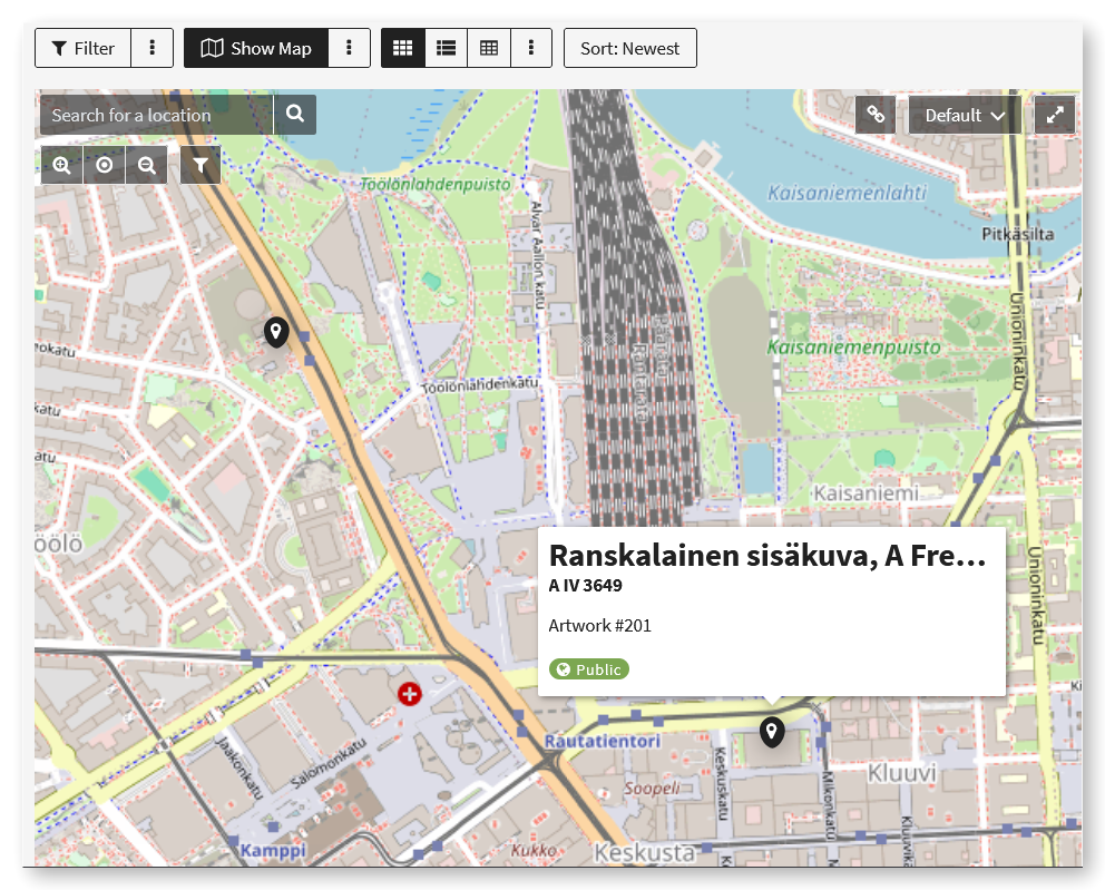 Kartta-esimerkki GeoJSON-lisäosasta, jossa näkyy teoksen sijainti Helsingin keskustassa.